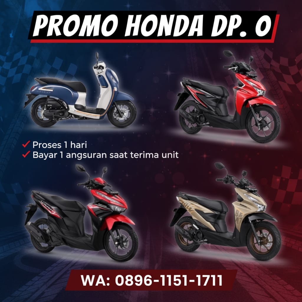Setiap pembelian motor Honda baru mendapatkan berbagai keuntungan, mulai dari gratis servis 4x, gratis oli selama 1 tahun, free helm, jaket, hingga safety tool. Syarat pengajuan kredit pun mudah, resmi, dan tanpa ribet.